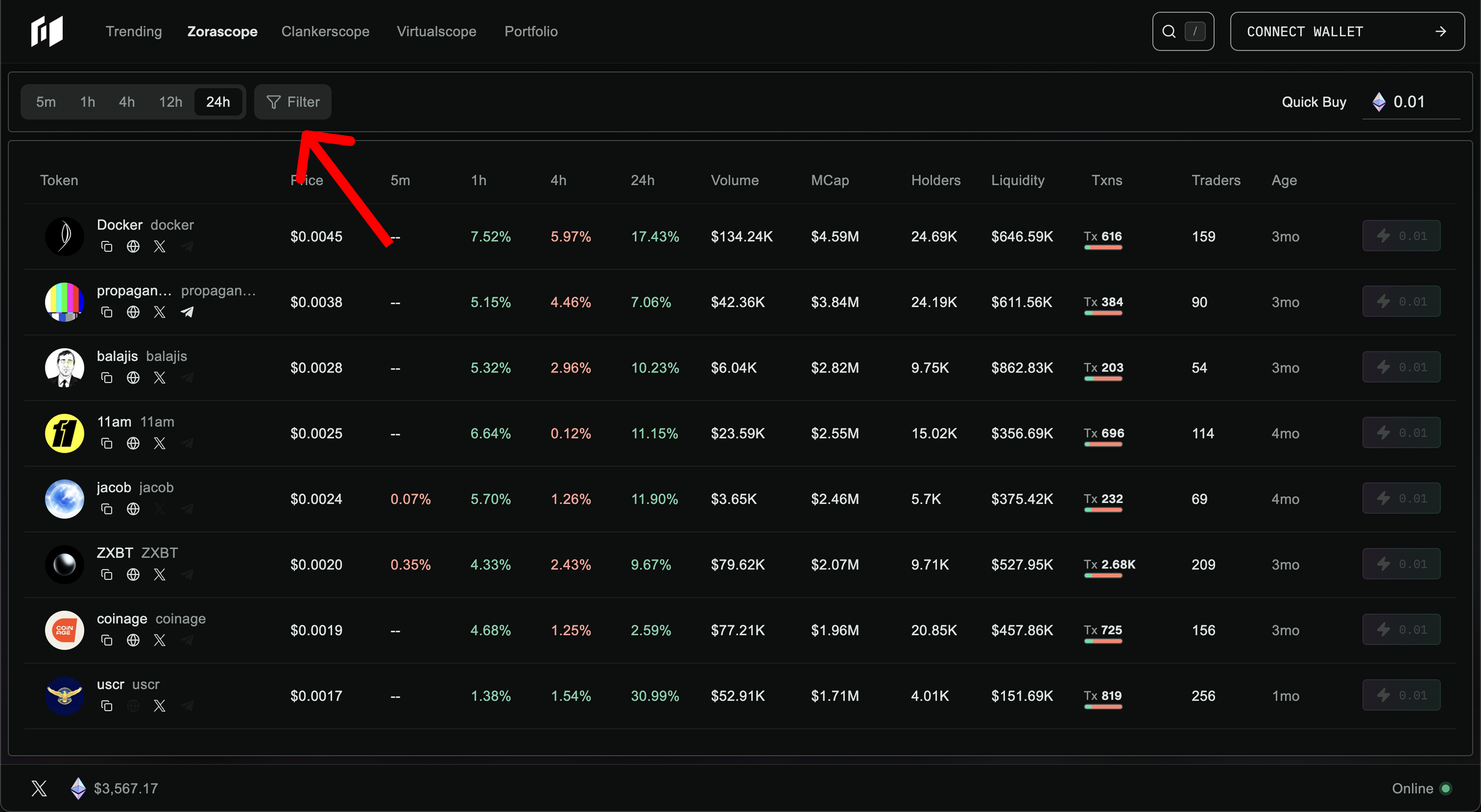 View the most active coins across the market. Sort and scan by metrics such as price performance, volume, liquidity, transactions, and trader activity to identify where momentum is building and which coins are gaining traction.