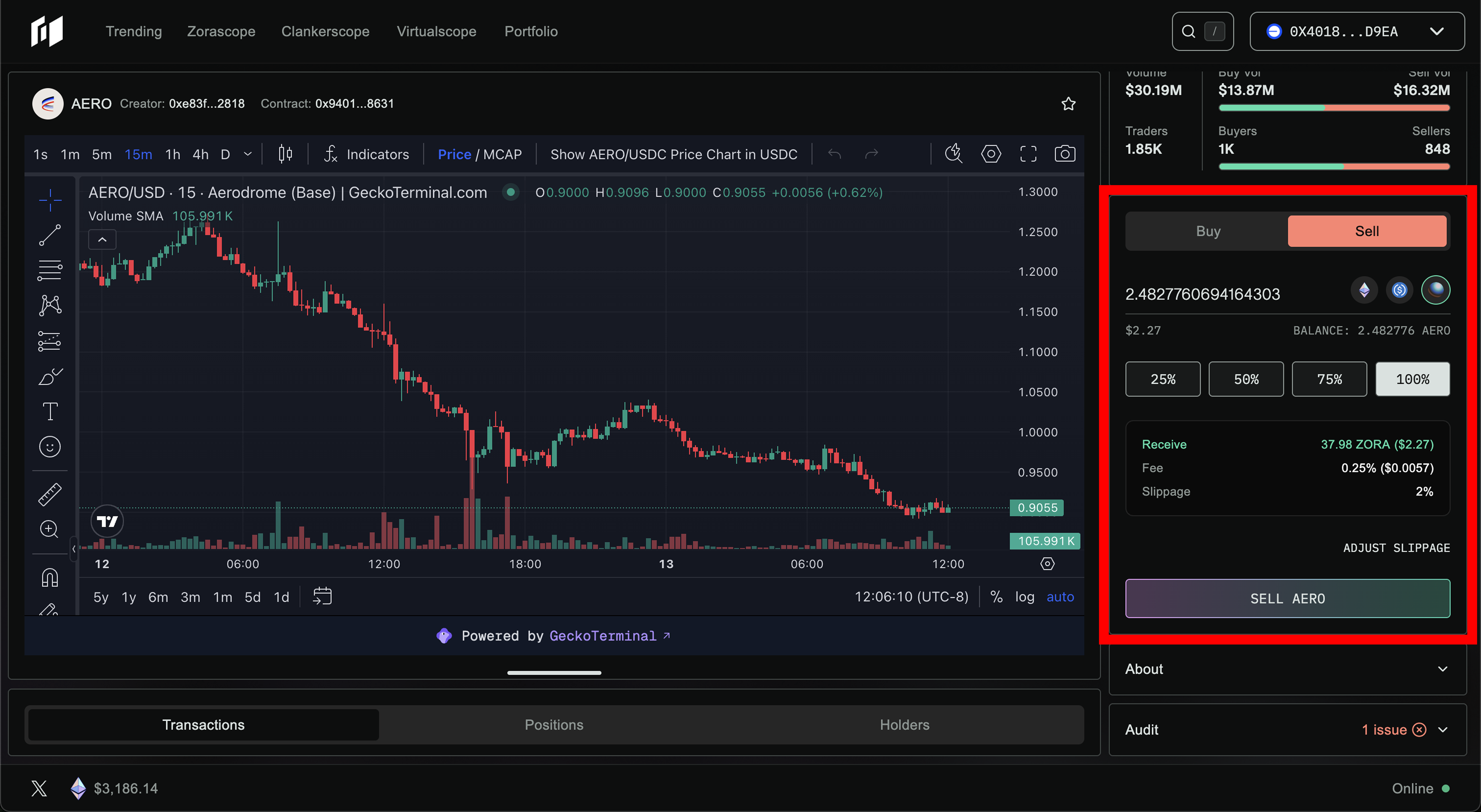 Place buy and sell orders directly from the trading interface. Enter your preferred amount, adjust slippage, choose your base pair (ETH, USDC, or ZORA), and review fees before confirming. All trades are executed through your connected wallet, ensuring full transparency and self-custody.